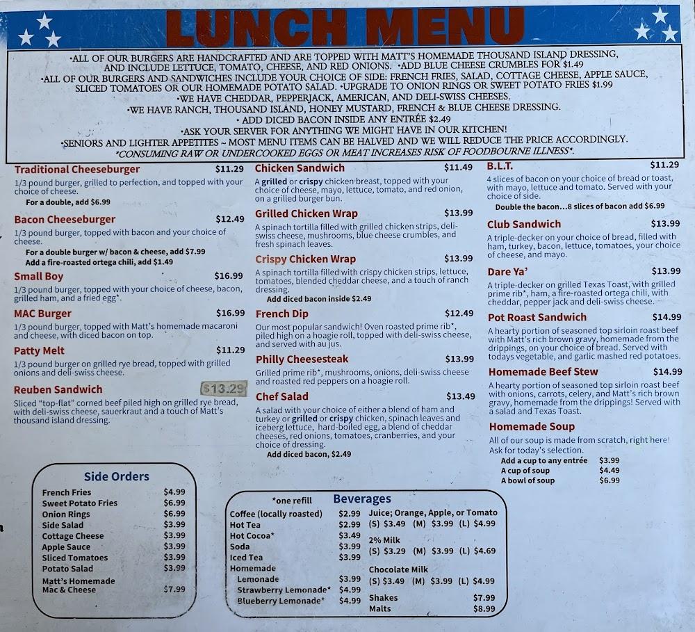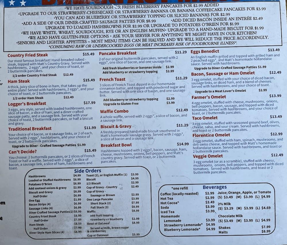 Matt and Mandy's menu is simple yet flavorful. Breakfast shines with hearty choices, including the Loggers Breakfast and traditional favorites. Guests admire generous portions and flavorful ingredients. There's also a variety of side orders like fries or salads. Unique dishes cater to many preferences, ensuring satisfaction for all. Visitors can explore daily specials that draw inspiration from local ingredients.