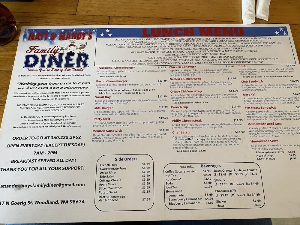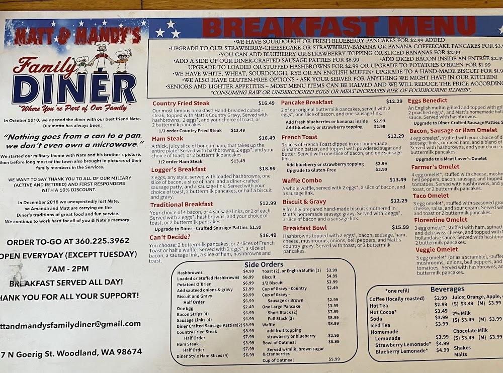 Welcome to Matt and Mandy's Family Diner, your cozy hometown spot where comfort meets community! Our dedication to scratch-made food means you'll never find anything from a can or a microwave here. Enjoy hearty breakfasts, lunch, and dinner served with warmth and a smile among walls adorned with local heroes and cherished memories. We offer a variety of menus catering to seniors and kids, alongside gluten-free options. With a welcoming atmosphere and great coffee, we invite you to savor the taste of tradition in every bite. Visit us at 1447 N Goerig St, Woodland, WA!